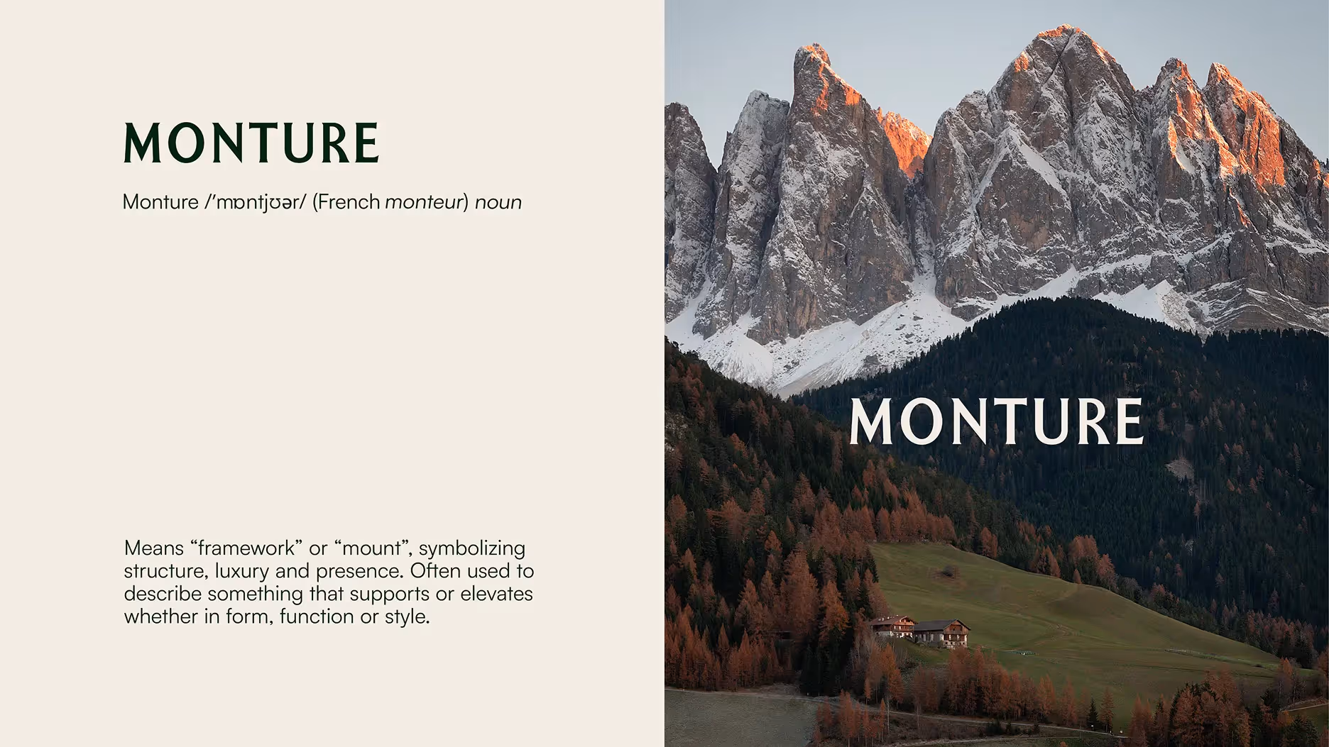 We developed the name Monture to reflect the brand’s refined, structured and heritage driven personality. The name draws from the French word meaning “framework” or “mount” to evoke a sense of elegance, stability and timeless style.